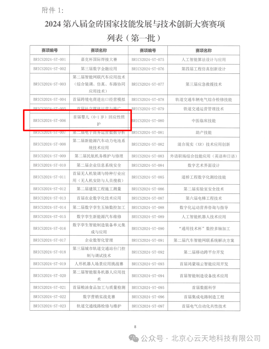 首届婴儿(0-1岁)回应性照护赛项(赛项编号:BRICS2024-ST-006)首次纳入金砖大赛赛项,是由北京心云天地科技有限公司承办的婴幼儿托育板块专业大赛,通过笔试和实操考核参赛选手婴儿回应性照护职业素养和回应性照护技能,展示学前教育与早教专业创新成果,提升幼儿教育与婴儿抚育专业人才的职业水平。