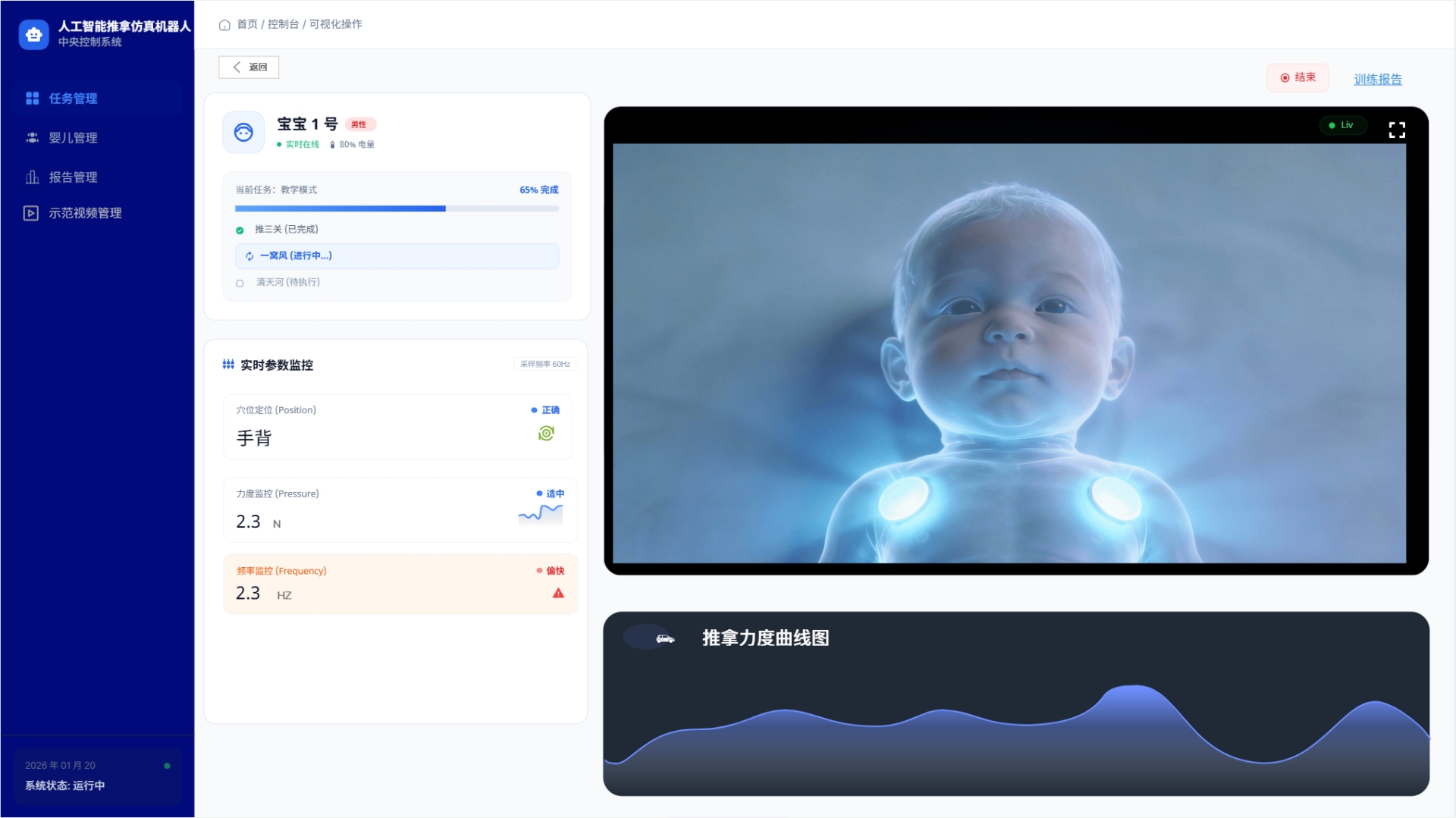 用于推拿仿真婴儿的任务发送和数据接收,可以以数字孪生的形式同步显示任务完成情况;学生可以学习小儿推拿的相关技术资源,老师可以使用系统内相关资源用于教学和训练。